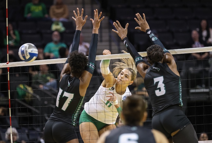 Oregon’s Morgan Lewis hits past the Hawai’i block of Caylen Alexander, left, and Amber Igiede/Stephen Burns